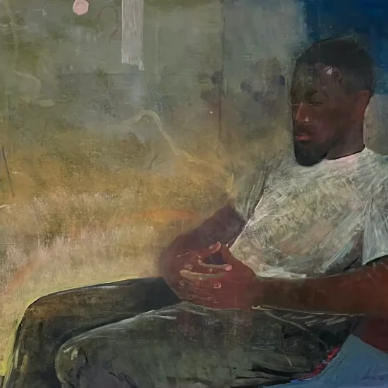 Dudley’s focus in this show is the figure sitting or standing in a room that often includes fantastical elements. In “Emmanuel” (2023–24), a barefoot Black man in casual dress, pictured nearly in profile, sits in a chair with his hands clasped on his lap and his eyes closed. Behind him is a textured field of yellowish-to-gray paint that suggests a desert, with a small full moon at the top edge. Is the man dreaming this? What held my attention was the juxtaposition of the observed and invented. There is no single interpretation, which encourages the viewer to closely examine the painting’s surface. The shift from the figure’s solidity of color to the ambiguous landscape and granularity of what looks like sand underscores the artist’s mastery of paint. She doesn’t impose a style on her subject, but lets the painting take her into fresh territory.