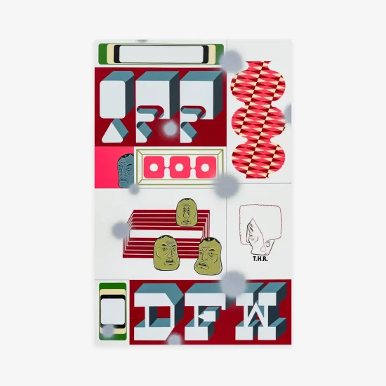Untitled, 2023, is based on an original painting by McGee that was montaged together with numerous images and patterns, familiar in his work – the “Everyman” heads, geometric patterns and “DFW” and “IFF” letters.