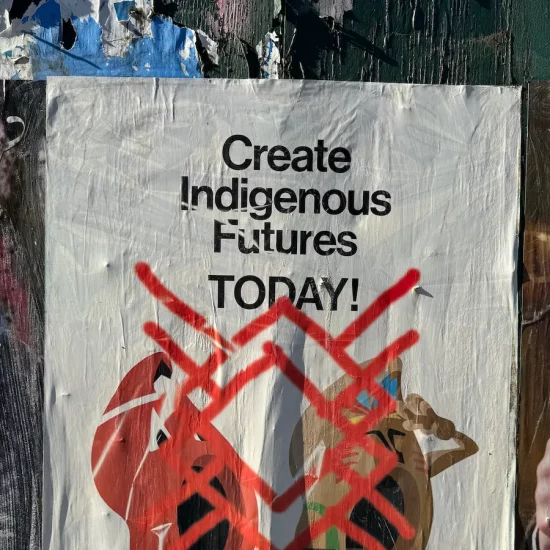 In the fall of 2023, if you walked down Jackson Avenue in Long Island City, you would have seen posters on the walls of a construction site that initially looked similar to any other advertisements — but their message was very different. The posters called to passersby with slogans such as “Create Indigenous Futures TODAY” and “Easy, Fast, & Reliable Rematriation Services.” The New Red Order, an Indigenous art collective created by Jackson Polys (Tlingit) and brothers Adam and Zack Khalil (Ojibwe), installed site-specific public artworks just behind those walls that articulated, with irony and bluntness, how those who benefit from colonization can actually learn and give back their lands. The artists ask us to imagine what a decolonized future can look like.