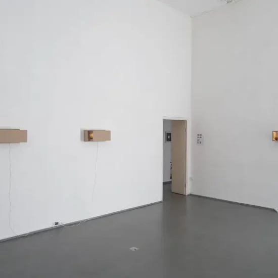 Turning the corner and entering the second room of the gallery, we are drawn in by the warm light pouring out of a series of drawers on the wall. Inside them, drawings, sketches and photographs are broken up and juxtaposed in the reflections of a series of mirrors. We have the impression of looking at an architectural model and wandering through the many changing mockup scenes.