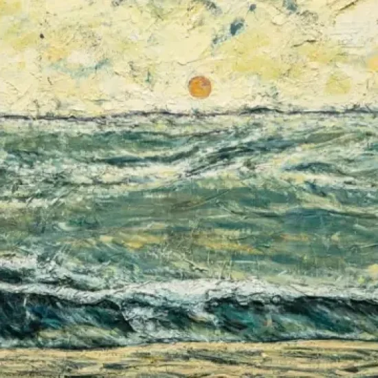 This meditative scene, like many of the featured works, appears weathered by its layers. Kim’s intricate process involves sketching, digital rendering, chemical transferring, and adding thick swaths of ink and pigment. The resultant works incorporate dense impasto, harboring the essence of many marks and concepts built into the fabric of each visual plane. This intricate process takes center stage in the textural work, Mythical Island. Here, a figure is engulfed by unforgiving terrain: compact coats of stirring gold, pink, and navy shade the forlorn intersection where the ocean meets the sky. The unyielding brushwork shades a man who holds up a dripping vessel in front of the sea—a prized discovery amidst the pitfalls of survival.
