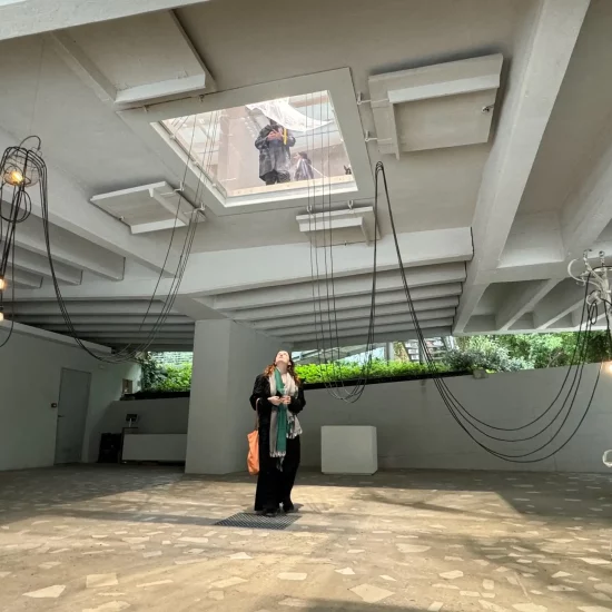 Having been at the Biennale site a week before opening day, I thought the iron scaffolding at the heart of Massimo Bartolini’s Due Qui was temporarily in place for a grand installation, only to realize this was the installation itself. The title is Italian for “two hear.” It’s a play on words with the English title To Hear, referencing two separate indoor installations. The larger, charismatic one is a complex array of iron bars, motors, and pipes playing an organ antiphon composed by Caterina Barbieri and Kali Malone. The height of the scaffolding creates a sense of being inside a cathedral, and the width and girth are laid out like a Baroque Italian garden as visitors crisscross the cavernous Arsenale space. At heart is “Conveyance,” a circular sculpture with a bench and what looks like pulsing water.