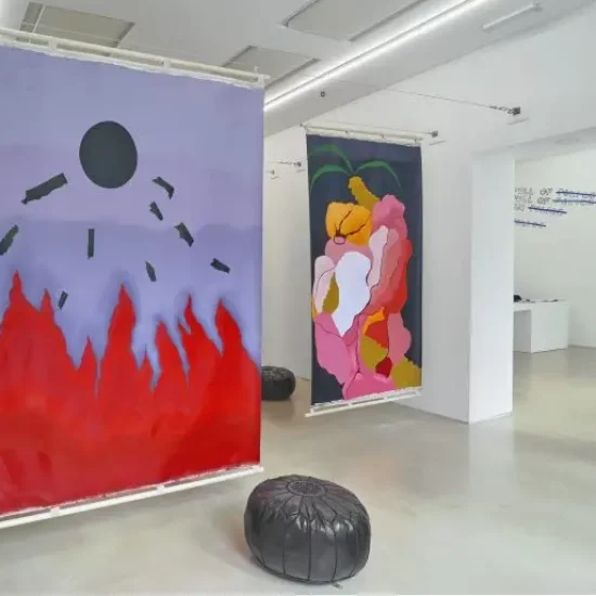 As you move through the gallery, a series of five large-scale oil paintings on linen are suspended between the gallery walls, resembling a thicket of trees. Installed so they can be easily moved and reconfigured, they create the possibility of new sight lines and offer spaces to reflect, hide and take refuge. The three largest paintings respond to texts by young people, depicting imagery of plant flesh, subterranean fires and plant life breaking through cracks in the pavement. At the front and rear of the gallery, paintings of a sun and moon act as grounding prayers and symbols, which mark the beginning and end of our days.