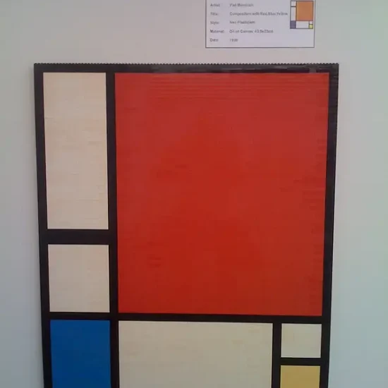 World War I led Mondrian back to the Netherlands, where he connected with other artists exploring new abstract ideas. In 1917, he co-founded the De Stijl movement with Dutch artist Theo van Doesburg. De Stijl, meaning “The Style,” was more than a simple art group. Its goal was to create a universal visual language, focusing on purity and simplicity. Mondrian and van Doesburg advocated for a pared-down style using only straight lines, right angles, and a strict color palette of primary colors — red, blue, yellow — alongside black, white, and gray. Mondrian called this approach “Neoplasticism,” aiming to strip away anything personal or emotional from his work, which he saw as a way to express universal truths.