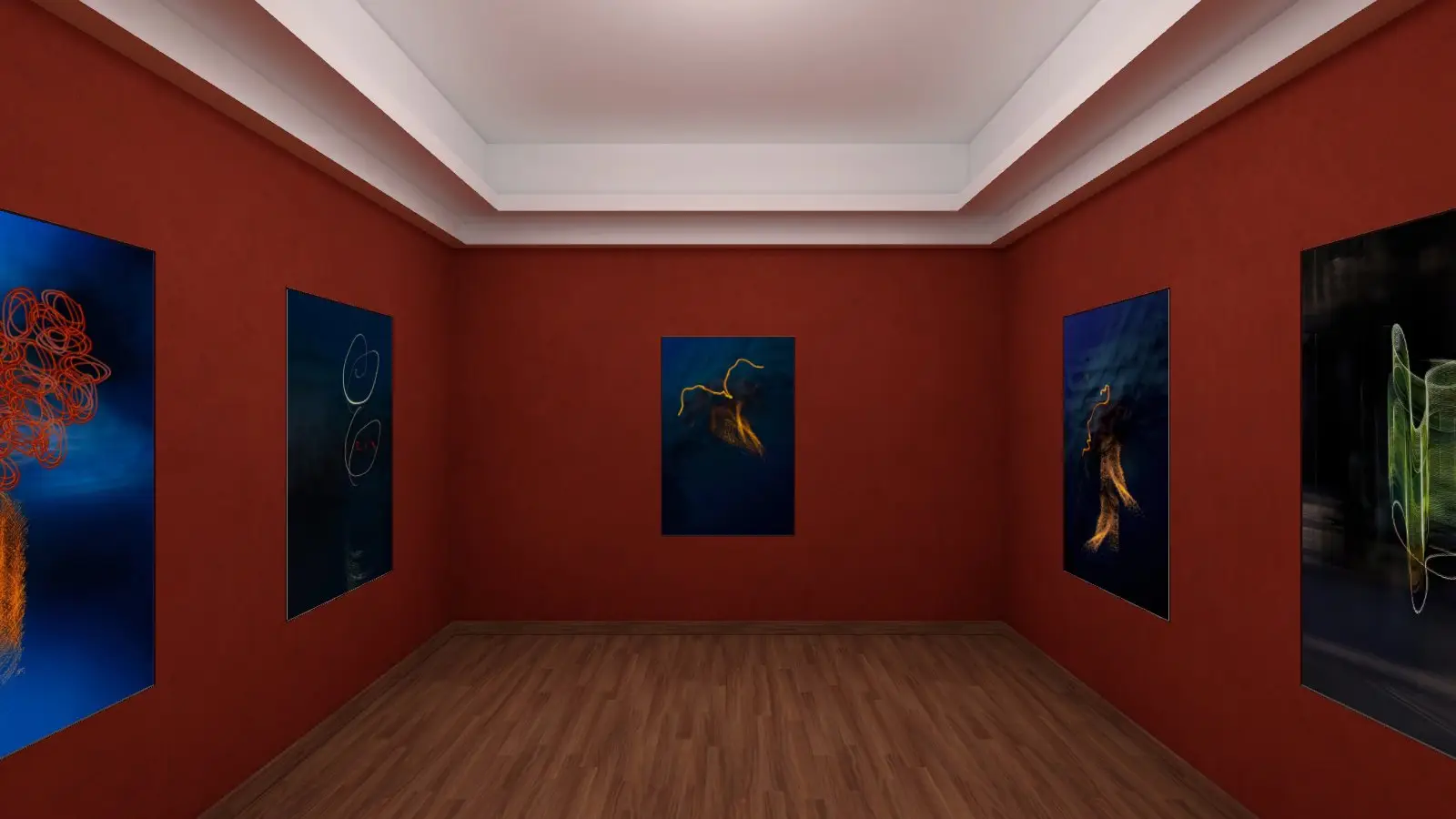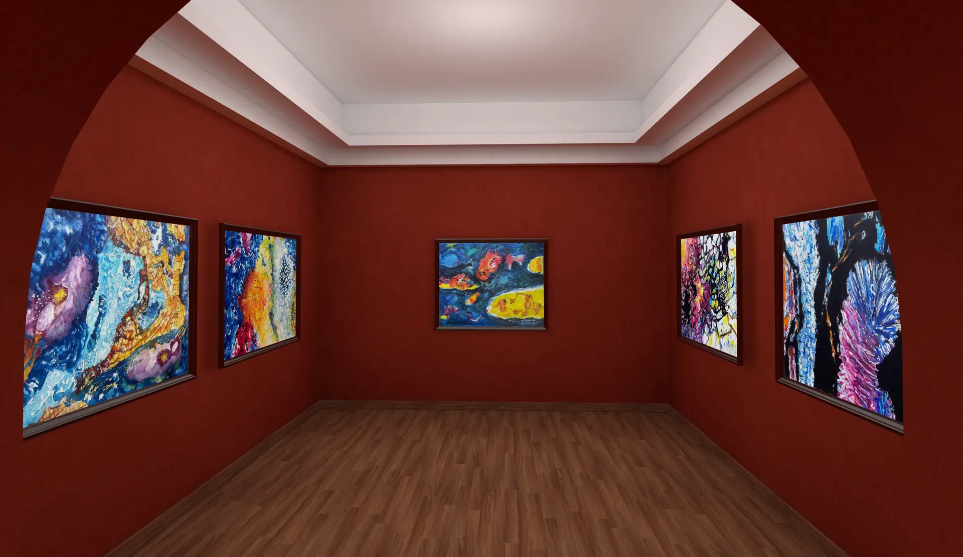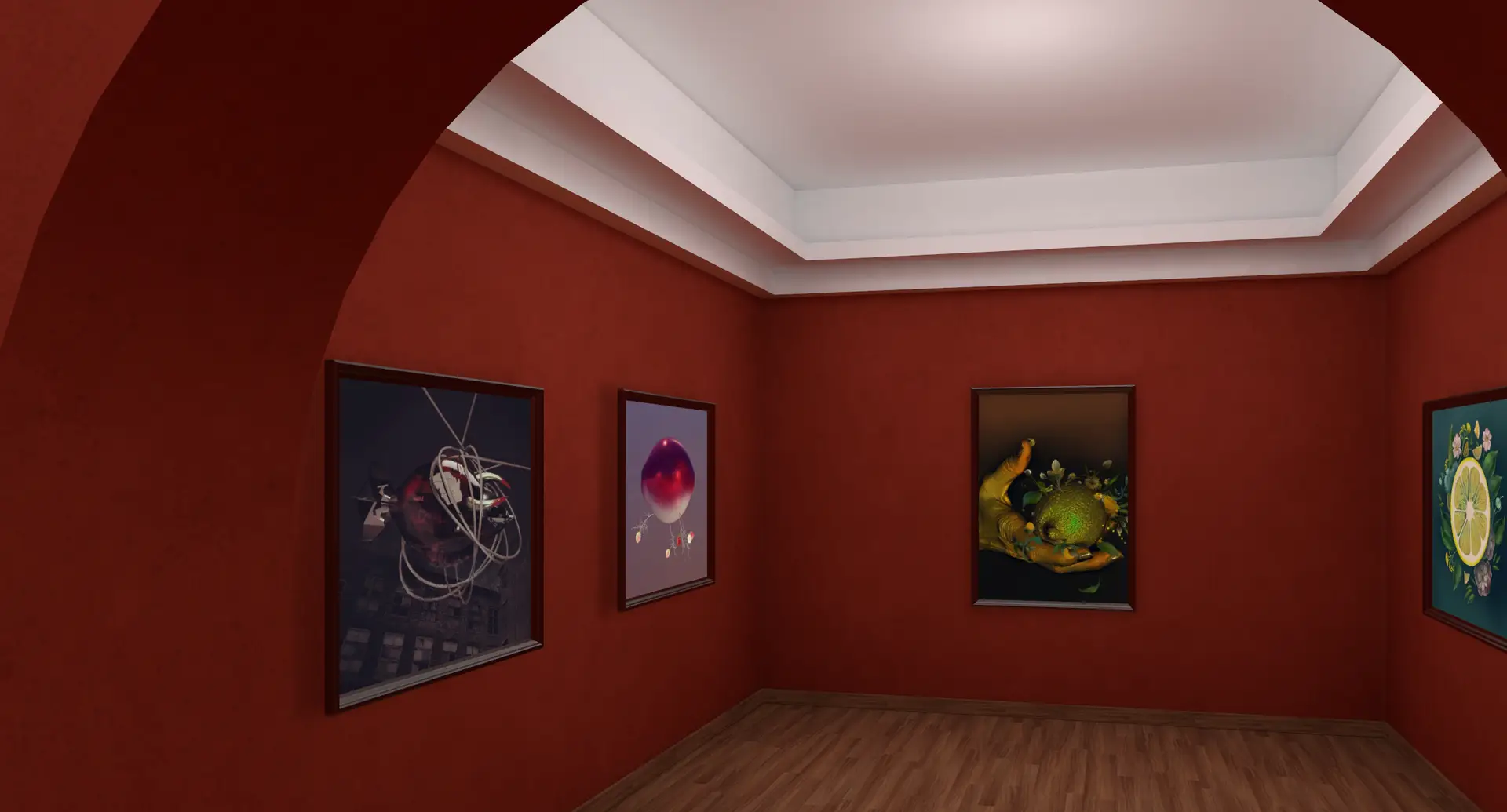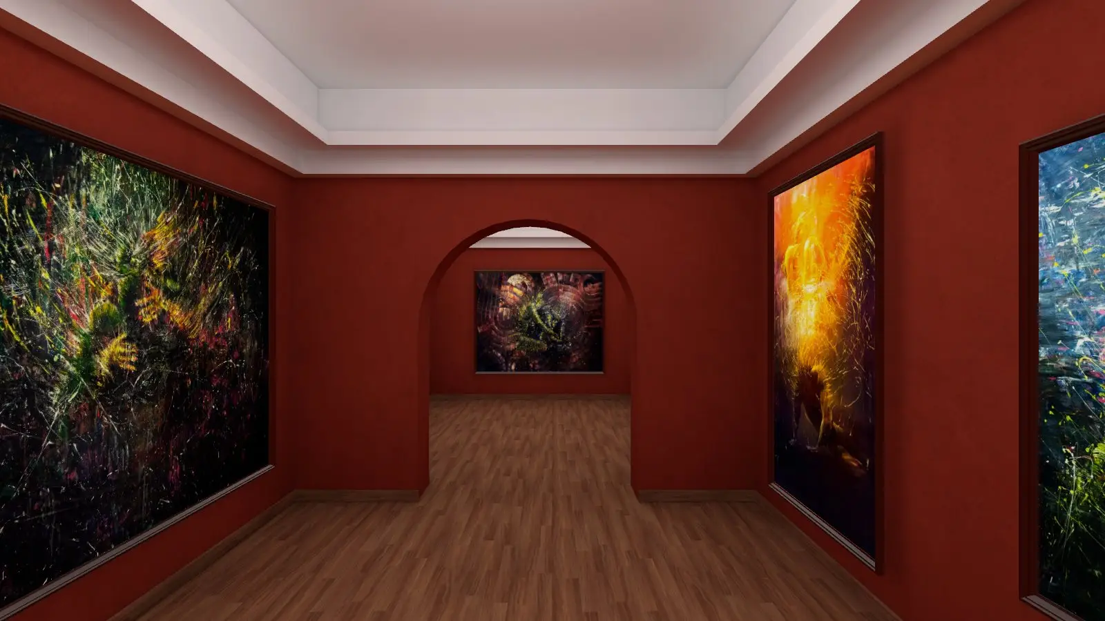 Step into a charming, museum-like space with the "Paris Secrets" template. This cozy, classic room features a rich red color scheme and an elegant arch, providing a sophisticated backdrop for up to 10 artworks. Ideal for intimate exhibitions that evoke a sense of classic artistry and elegance.