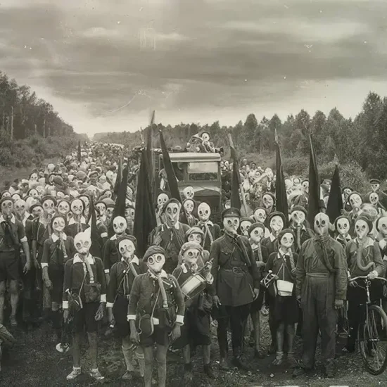 Members of the Young Pioneers, a Soviet government youth group, don gas masks as part of an attack preparation drill in the Leningrad area in 1937.