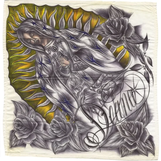 I first encountered paño arte, intricate ink or pencil drawings on handkerchiefs created by incarcerated Chicanos, as a boy in south Texas. My older cousin had received a letter from Huntsville State Penitentiary. Every inch of the envelope was decorated with an elaborate web of images executed in ballpoint pen. Vegetal motifs sprouted roses and daisies; tangled ivy revealed a menagerie of half-hidden doves, peacocks, and feathered serpents. Inside the envelope was a greater treasure: a cotton handkerchief emblazoned with a stunning drawing of the Virgin of Guadalupe.