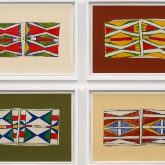 The designs found on these utilitarian cases are representative of both Apsáalooke and Plateau aesthetics. While each tribe has its own distinct style, there are similarities between their handiwork as a result of their shared history of craftsmanship and trade. Red Star’s project aims to acknowledge and explore how the material cultures of these tribes became intertwined over the course of time, while highlighting the unique artistic tradition of each. By researching and documenting existing bishkisché from various sources, she creates painted studies that serve as a new art historical record. In doing so, Red Star honors the rich legacy of both Apsáalooke and Plateau women who contributed to this tradition.
