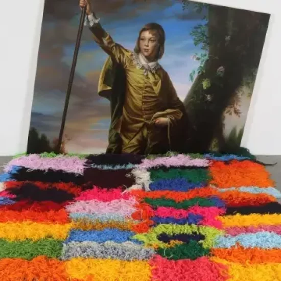This work is a continuation of my ‘Dirty Laundry’ series which spawned from the pandemic and examined my trajectory as an artist and individual as a whole. ‘Zippers Short and Skinny’ was created after moving from Denver to New Hampshire. I grew up in NH, but spent 10 years in Denver. Living in the city, you take for granted the progressive atmosphere you are surrounded by. It was culture shock moving back to NH and had to adjust (or at least get comfortable with) with the more conservative mindset of NH. The male bravo is more showy and, to me, over the edge. With ‘Zippers,’ I wanted to create a softer approach to the male portrait combing them with soft, satin fabrics and handwoven latch hook weavings.